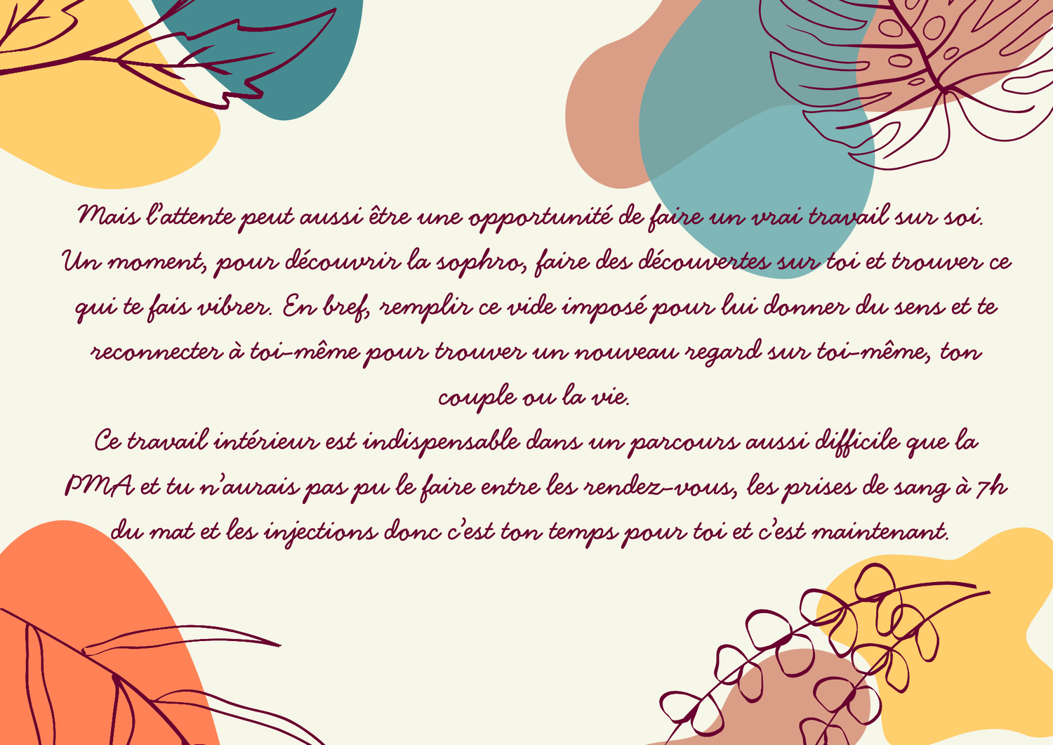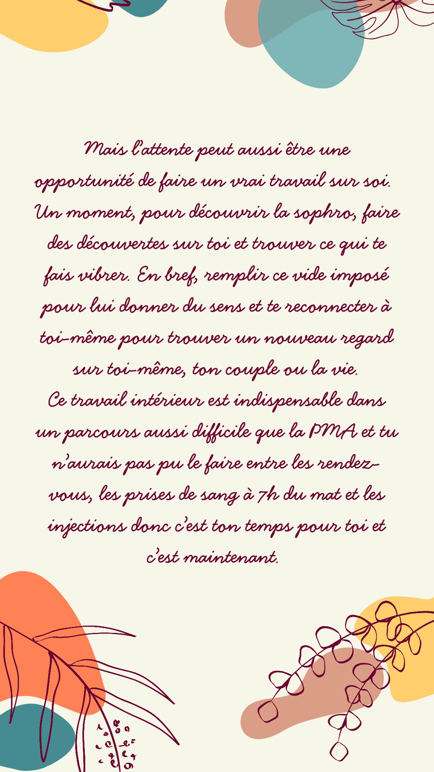 La sophrologie ne se substitue pas aux professionnels de santé, je ne prodigue pas de diagnostic, de prescriptions médicales, je n'interférerai jamais avec des traitements médicaux en cours et je ne suis pas qualifiée pour donner mon avis sur un choix à faire pour ton parcours PMA.